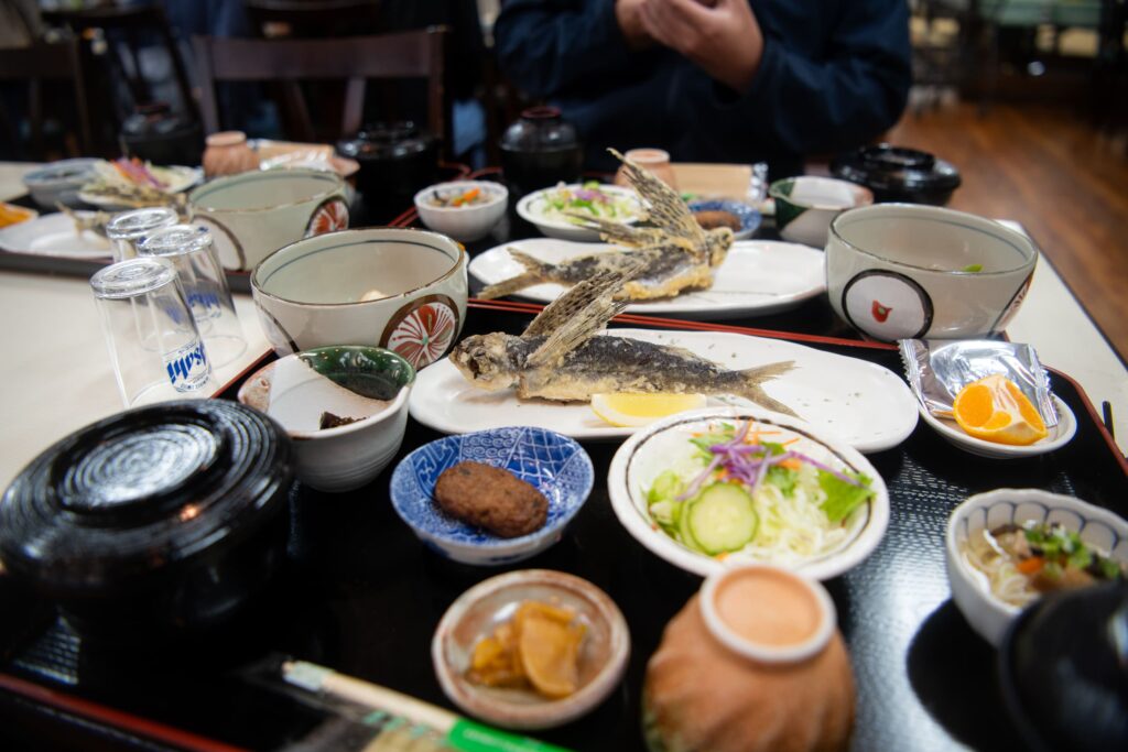 お昼は名物の飛魚定食!飛んでいる姿のまま揚げられています。