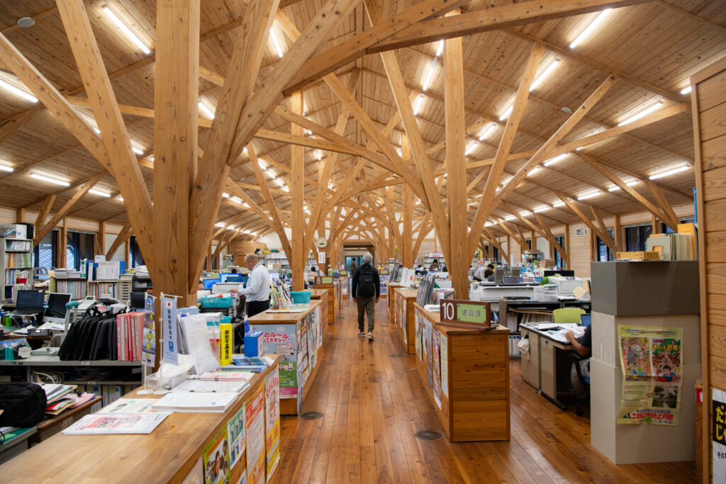 屋久島町庁舎を見物します。まるで森にいるかのような軸組です。