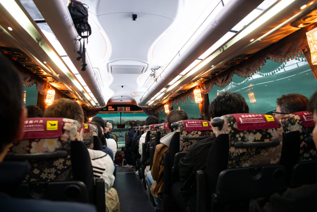 指宿港に到着。ここからは大きなバス1台で移動。温泉ホテルへ向かいます。
